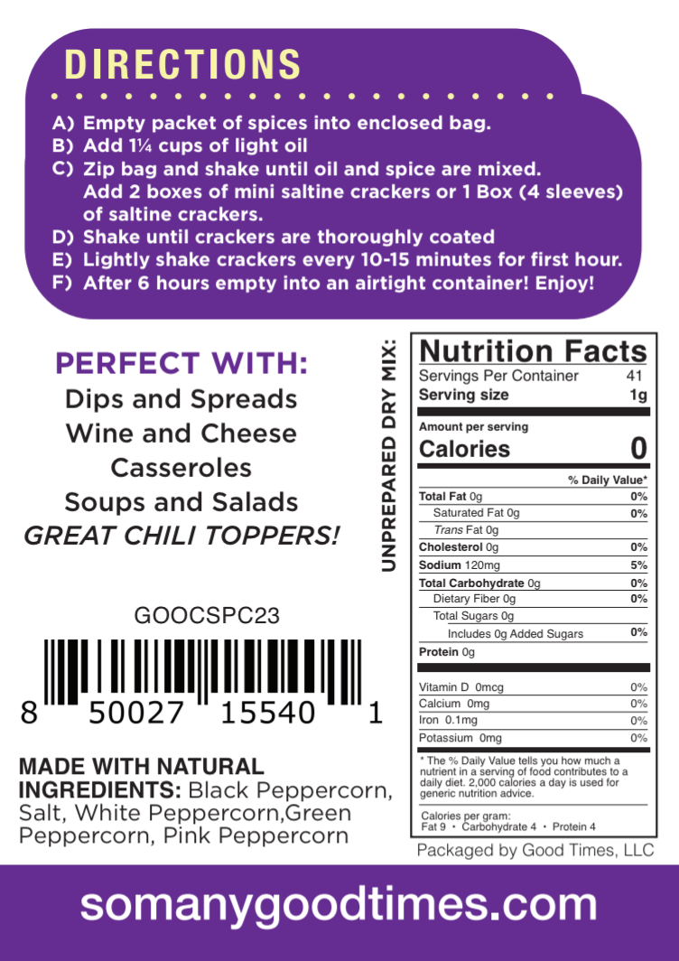 A unique blend of 5 peppercorns makes this Cracker Smack® both delicious and addictive!