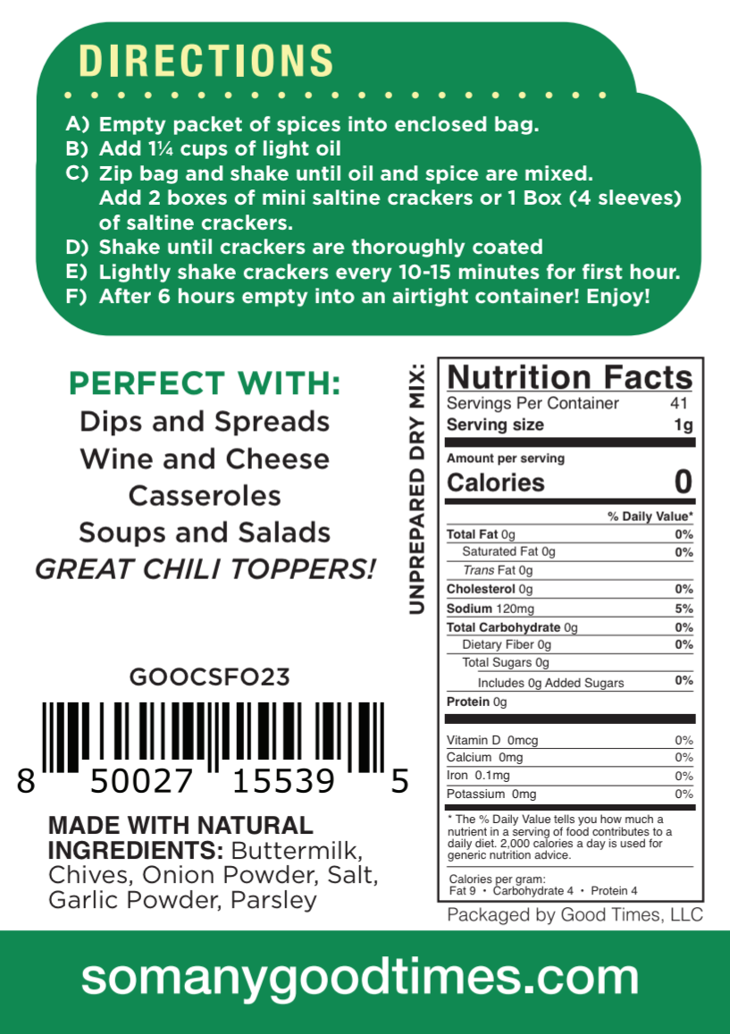 Delicious when finished crackers are crunched over your favorite dish as a panko crumb. Over a salad as a crouton or as a topping on Soups, Chowders, or Chili!