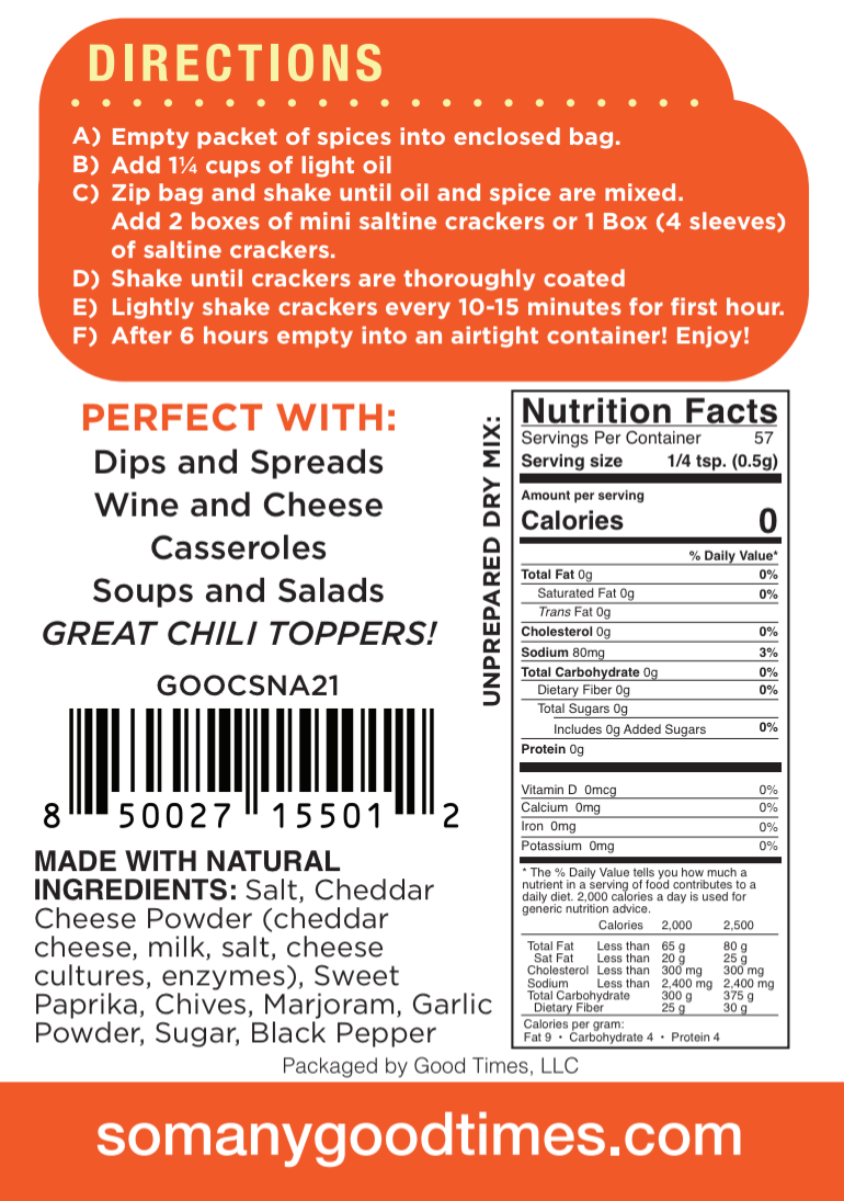 Make your snacking dreams come true with Cracker Smack - Nacho! Our natural ingredient cracker blends are sure to satisfy your cravings in one shakey, no bakey bag! This gifty package includes our unique spice blend and a mixing bag. You just add 1 1/4 cups of a lightly flavored oil and 2 Boxes of Nabisco® Mini Premiums. Shake, Shake, Shake and lie flat in the mixing bag on your counter for 6-8 hours. Then transfer to an airtight container. Time for an adventure in snack-tivity!